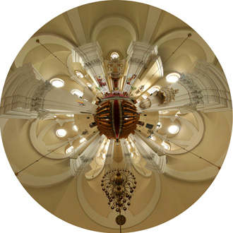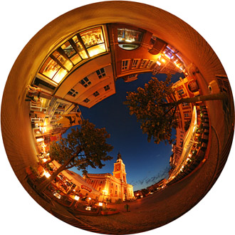 • Kule (sfery) 2D Obraz panoramiczny 360° nadaje się do przygotowania szczególnego typu obrazu zamkniętego w okręgu. Obraz może przypominać odbicie obrazu w lustrzanej kuli lub nasuwa skojarzenia z tunelem |